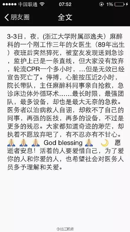 前夜里,一位在浙江大学医学院附属邵逸夫医院麻醉科参加住院医师规范化培训的年轻麻醉师,被室友发现倒在家里,经过8个多小时的抢救,今天凌晨宣布死亡。
