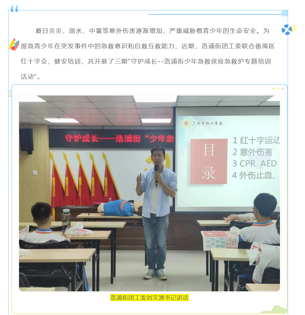 截至6月17日,洛浦街团工委共举行了三期少年急救侠培训,共180名青少年参与其中,收获满满!洛浦街团工委书记刘文湧表示:此次培训活动的开展为社区青少年们普及了许多危急情况下的急救基础知识以及心肺复苏的操作应用,让更多的青少年了解掌握基本急救知识和急救技能,在灾难面前能够做到自护、互救,让孩子们健康成长、快乐起航,在即将到来的暑假,该项活动将继续全面铺开,力争把红十字会精神和应急救护知识传播到每家每户。
