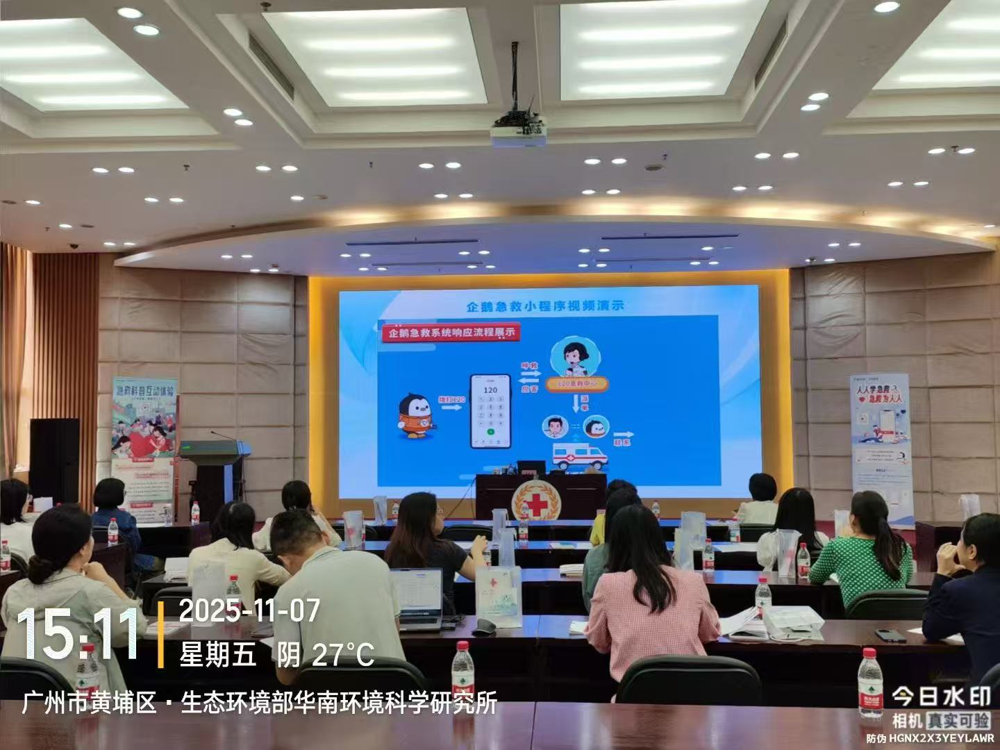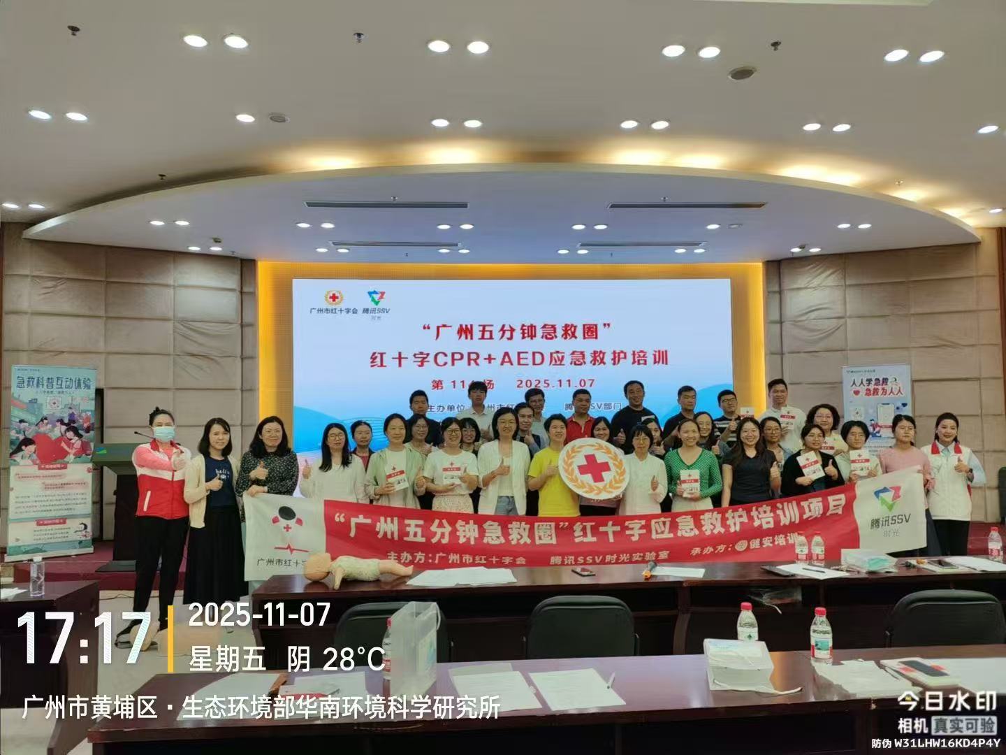 2025年11月7日,由广州市红十字会与腾讯(SSV)联合主办、健安应急救护培训中心承办的2025年度“广州五分钟急救圈”项目第114场走进生态环境部华南环境科学研究所开展的CPR/AED 持证专场培训圆满落幕。本次培训吸引了30名职工参与,通过高效紧凑的专项学习,实现了急救知识与实操技能的双重提升。