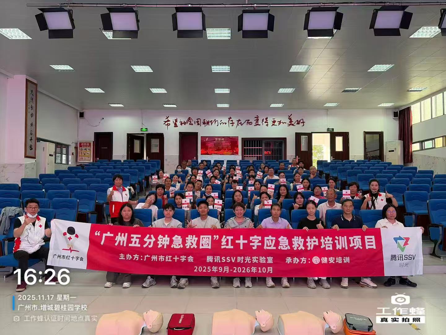 为切实强化校园安全教育,全面提升教职工应对突发状况的应急救护能力,2025 年11月17日,由广州市红十字会、腾讯 SSV 部门联合主办、健安培训承办的 2025 “广州五分钟急救圈” 项目第 128、129 场红十字 CPR+AED 持证专场培训分别在上、下午成功举办。本次培训以核心救命技能为聚焦点,面向增城区中小学教职工开展,当天共有 105名教职工参与。