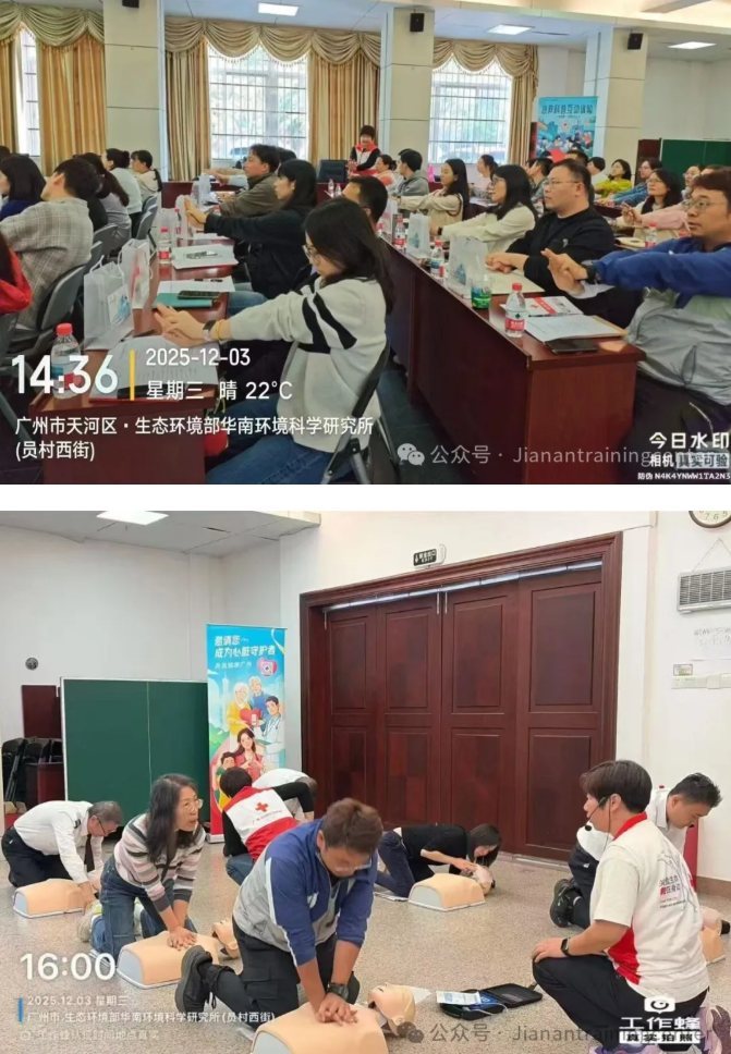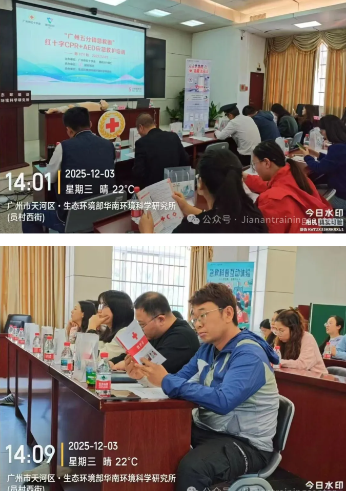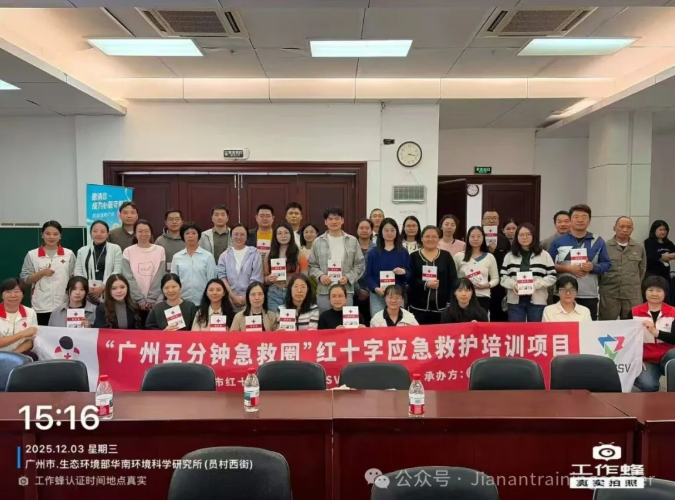 为强化科研单位应急处置能力,提升职工应对突发意外的救护水平,由广州市红十字会、腾讯SSV部门联合主办的2025“广州五分钟急救圈”项目走进华南环境科学研究所,于2025年12月3日下午成功举办红十字CPR+AED专项救护员培训班。来自该所的29名科研及管理人员参与了本次为期4学时的系统培训,全员顺利通过考核并获得救护员资格认证。
