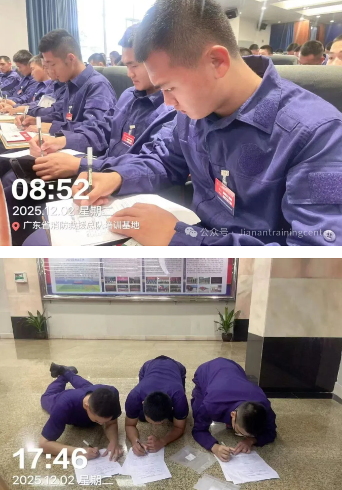 考虑到新消防员集训任务繁重,健安培训特意优化学习安排,让学员利用训练间隙见缝插针完成线上理论学习。最终,89名学员全部顺利斩获线上结课证书,为线下实训筑牢了理论根基。线下授课当天,一个拄着拐杖的身影格外引人注目——这位新消防员因训练意外扭伤脚踝,却仍坚持到场参训。他坦言:“这门课程太实用了,多听一次、多看一遍,对未来的救援工作都有极大帮助,所以我必须珍惜每一次学习机会。”这份执着与热忱,深深感染了全场学员,也成为“火焰蓝”队伍好学笃行的最佳注脚。
