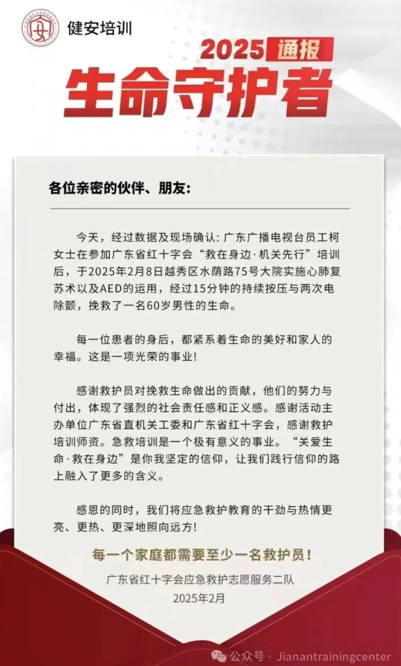 2025年6月1日晚,广州威力羽毛球馆科学城分馆学员与现场众人上演了一场“教科书式”的生命救援,救助了一位突发心脏骤停的球友。也是健安培训学员成功拯救的第27条生命!这不仅是生命的奇迹,更是健安培训高质量教学成果在真实场景中的完美转化!