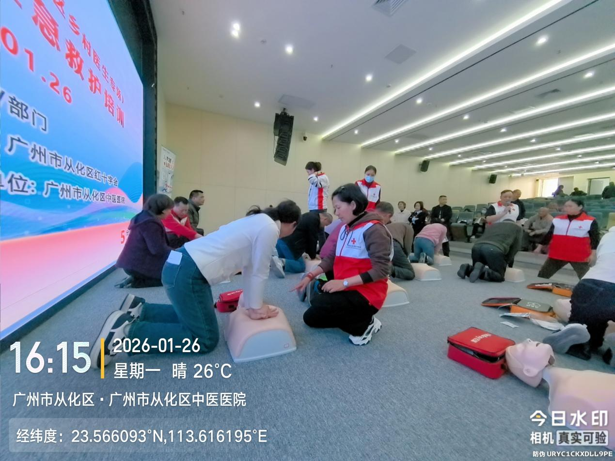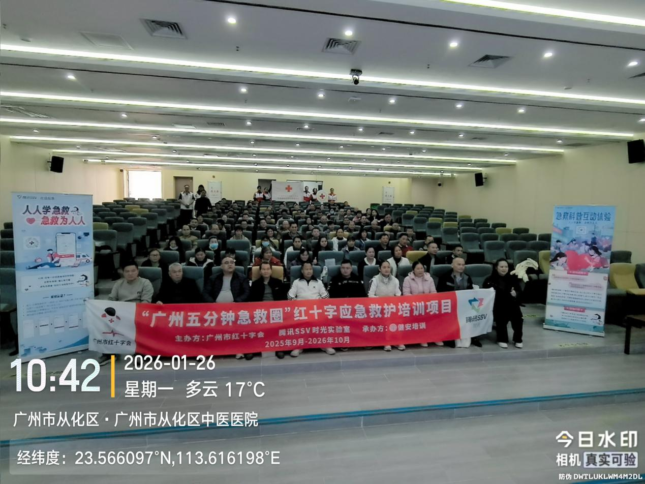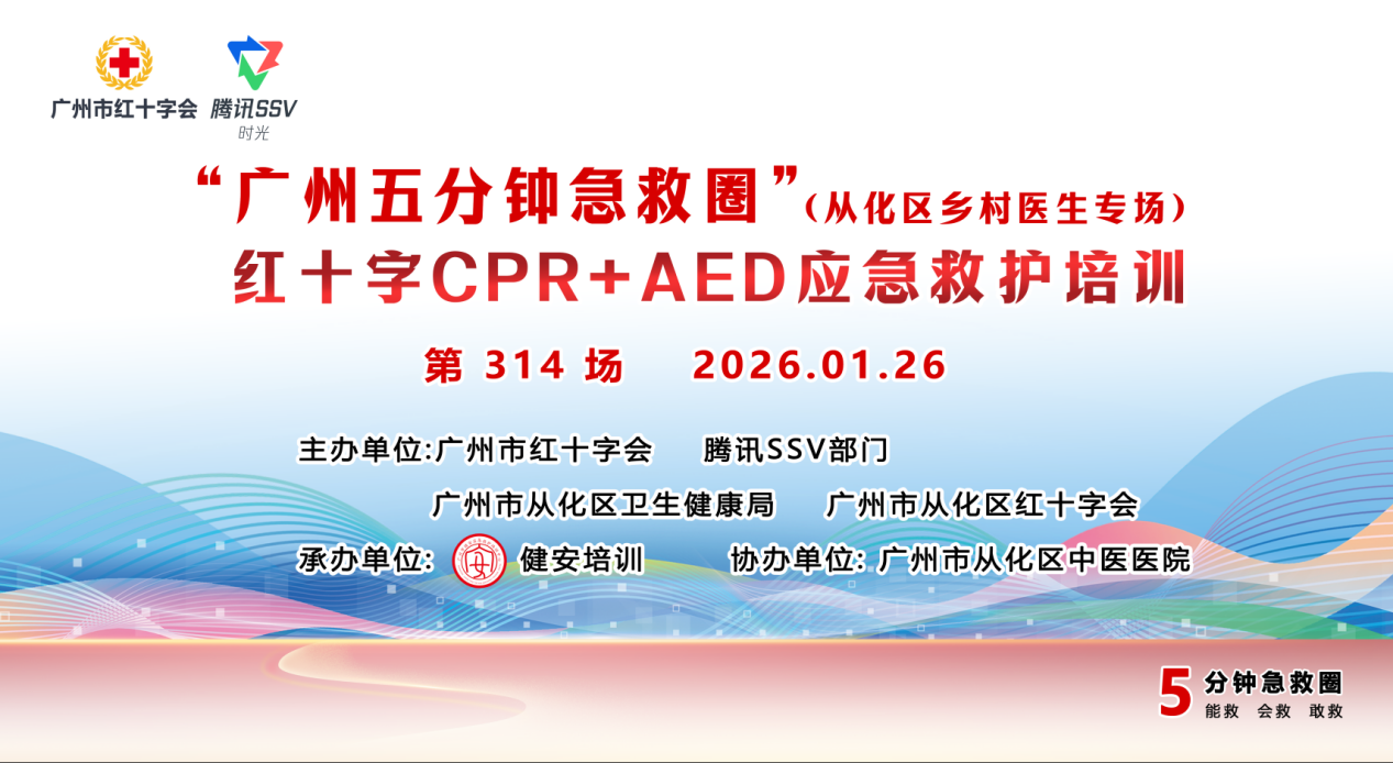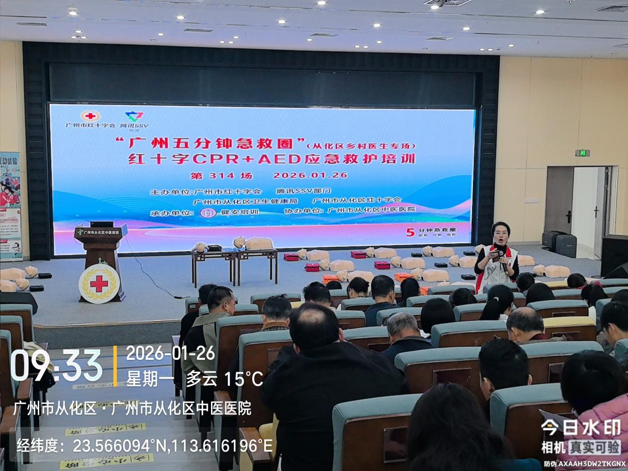 地处广州东北部的从化区,村落分布相对分散,部分偏远村居距离城区医疗机构较远,乡村医生是守护村民健康的“第一道防线”,更是突发意外时抢占“黄金4分钟”的关键力量。2026年1月26日,“广州五分钟急救圈”第314、315场红十字CPR+AED应急救护培训(从化区乡村医生专场) 圆满举办,共228名扎根从化基层的乡村医生齐聚一堂,系统学习专业急救技能。本次培训由广州市红十字会、腾讯SSV部门、广州市从化区卫生健康局、广州市从化区红十字会主办,健安培训承办,广州市从化区中医医院协办。精准锚定基层急救痛点,为从化乡村急救队伍注入强劲动能,让“五分钟急救圈”的守护触角延伸至偏远村居的每一处角落。