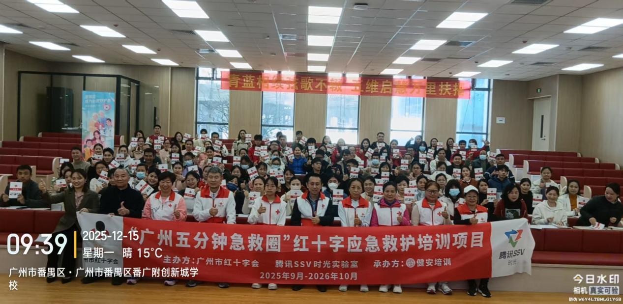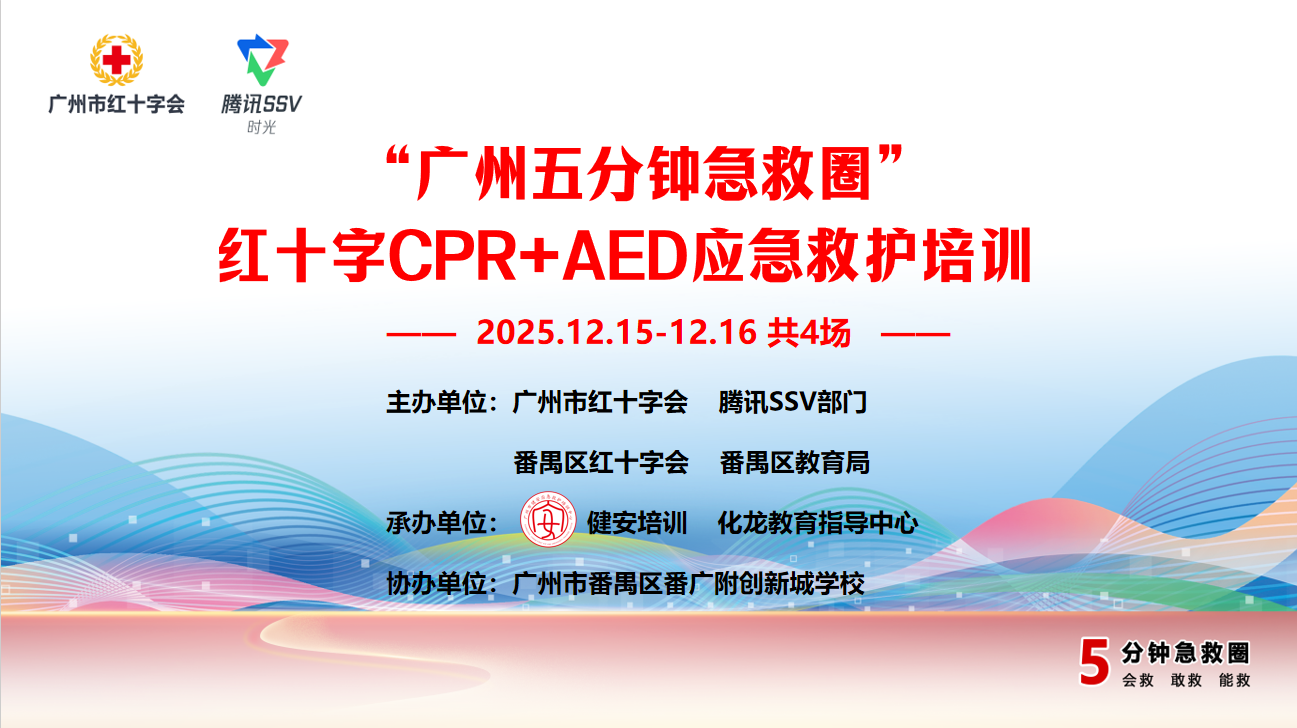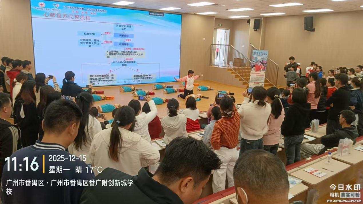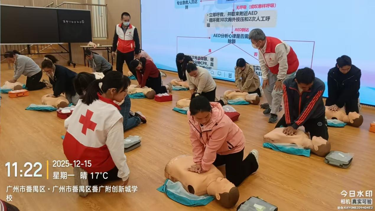 校园安全无小事,急救技能是守护师生生命健康的第一道防线。12月15日至16日,由广州市红十字会、腾讯SSV部门主办的2025“广州五分钟急救圈”项目,携手番禺区教育局化龙教育指导中心,在广州市番禺区番广附创新城学校连续开展4场CPR+AED专项培训,为366名中小学及幼儿园教职工系统赋能,全面提升校园应急救护能力。