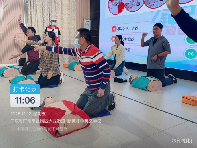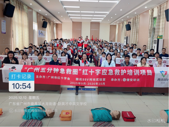 2025年12月12日,由广州市红十字会、腾讯 SSV 部门主办,番禺区红十字会、番禺区教育局、健安培训与石碁教育指导中心联合承办的 2025 “广州五分钟急救圈” 项目 —— 红十字 CPR+AED 应急救护培训第 203 场,在广州市番禺区新英才中英文学校顺利举办,为辖区内中小学、幼儿园教师带来了一堂意义非凡的生命守护课。