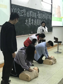 在志愿者应急救护培训环节,健安培训中心的老师通过生动语言以及场景模拟带动整个培训气氛,同学们认真听讲,积极参与互动演示。