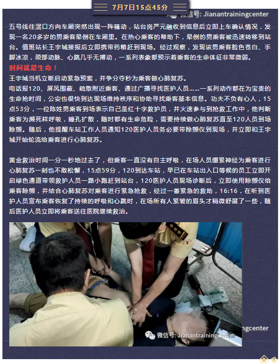 在事件发生时,地铁工作人员快速反应,有序、正确救援,凭借学习的急救知识为伤员赢得了宝贵的救治时间!