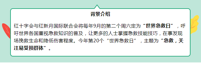 今年第20个“世界急救日”,主题为“急救,关注易受损群体”。