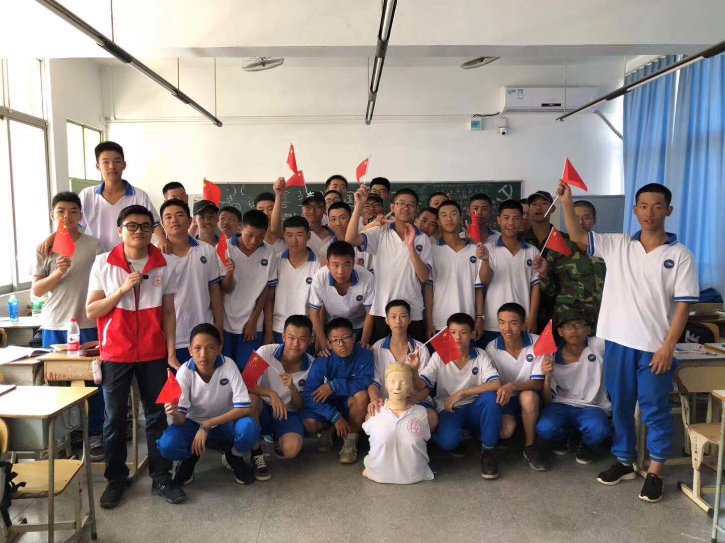 为响应“健康中国”号召,做好校园安全建设,健安急救师资团队一直在行动,不知不觉间广州市学生徒手心肺复苏技能普及教育活动已经顺利开展了三十场。适逢即将迎来中华人民共和国成立70周年的纪念日,特意安排了迎国庆环节,健安老师和黄埔职业技术学校20个班约750名学生齐聚一堂,挥动手中的五星红旗,唱响《我和我的祖国》,欢庆新中国成立70周年华诞。