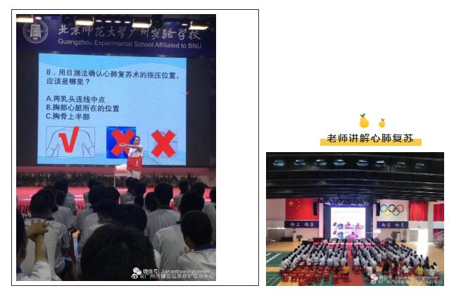 10月9日下午,广州市学生徒手心肺复苏技能普及教育第三十二场走进北京师范大学广州实验学校,为其6个班约150名学生进行徒手心肺复苏培训。