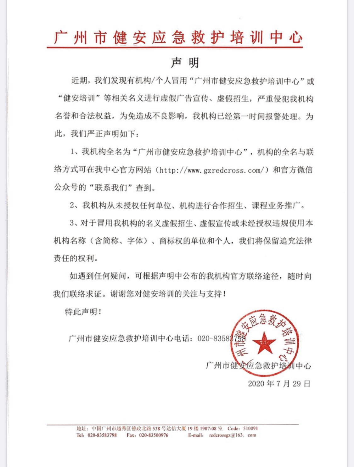 1、我机构全名为“广州市健安应急救护培训中心”,机构的全名与联络方式可在我中心官方网站(http://www.gzredcross.com/)和官方微信公众号的“联系我们”查到。2、我机构从未授权任何单位、机构进行合作招生、课程业务推广。3、对于冒用我机构的名义虚假招生、虚假宣传或未经授权违规使用本机构名称(含简称、字体)、商标权的单位和个人,我们将保留追究法律责任的权利。如遇到任何疑问,可根据声明中公布的我机构官方联络途径,随时向我们联络求证。谢谢您对健安培训的关注与支持!