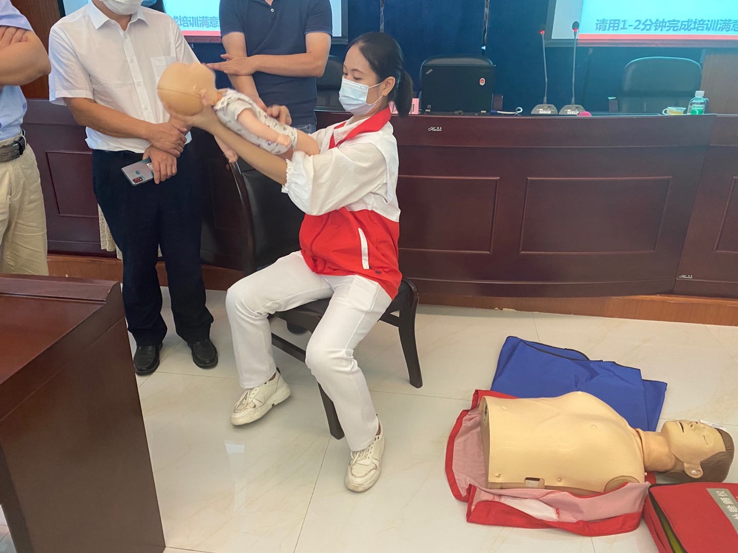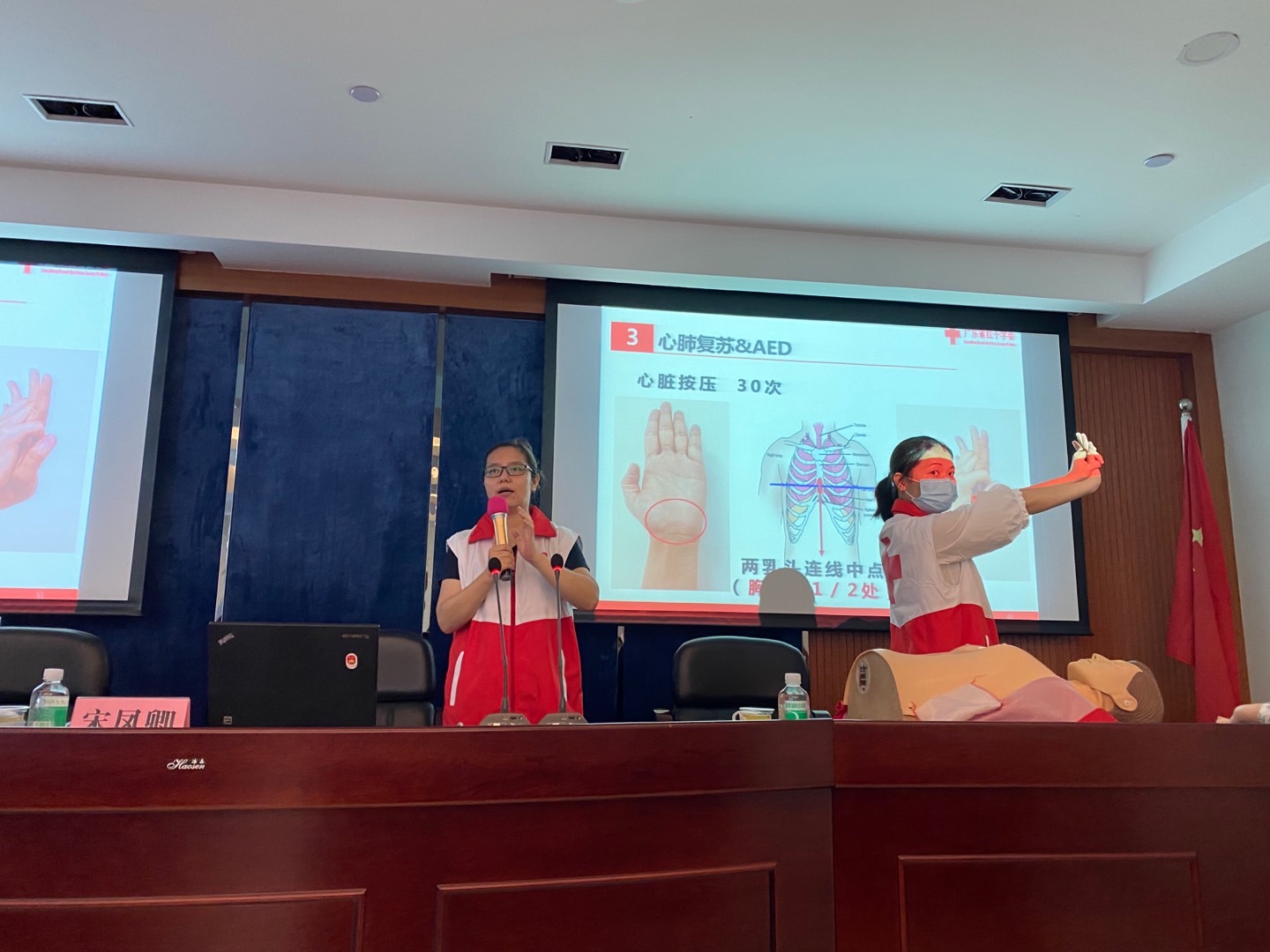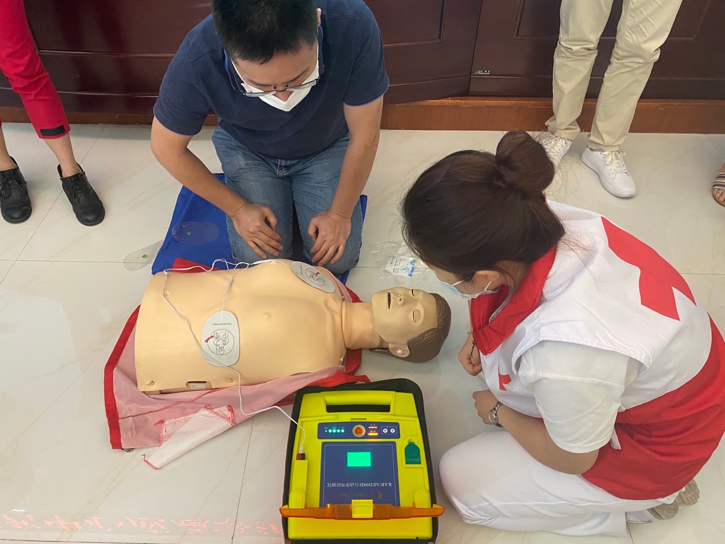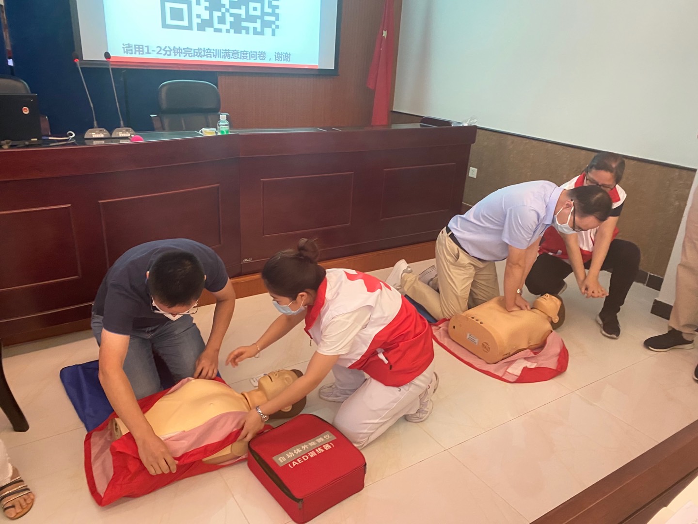 此次培训由广东省红十字会志愿者中山大学孙逸仙纪念医院宋凤卿教授进行理论讲解,通过案例及知识点分析,强调现场救护的重要性以及黄金时间、白金时间概念。培训第二部分是由广东省红十字会志愿者团队带领参与学员分组进行实操训练。