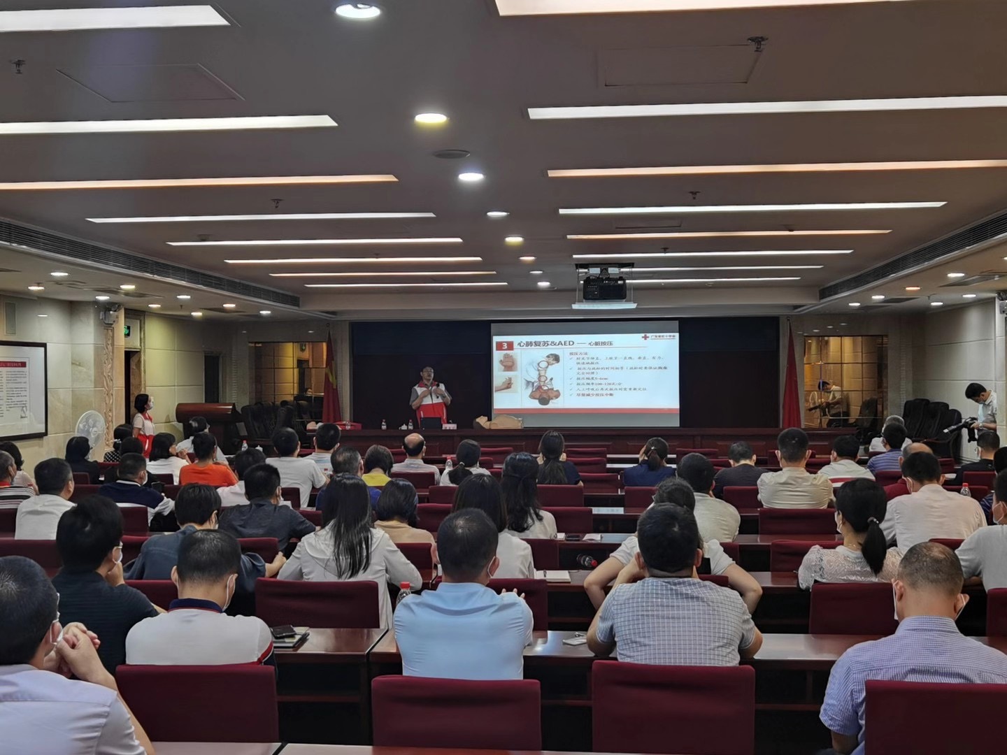 课程邀请到了广东省红十字会志愿者中山大学孙逸仙纪念医院蒋龙元教授为党员干部职工代表们进行专题讲座。教授详细讲解了红十字运动基本知识,应急救援以及急救的要点,重点介绍了心肺复苏紧急救护的基本原则、方法与步骤。培训课程理论联系实际,广东省红十字会志愿者团队利用模型示范心肺复苏的检查意识、胸外按压、人工呼吸等过程,并邀请现场学员进行模拟实训。学员们认真听讲、适时提问,整个培训课程张弛有度、气氛活跃。