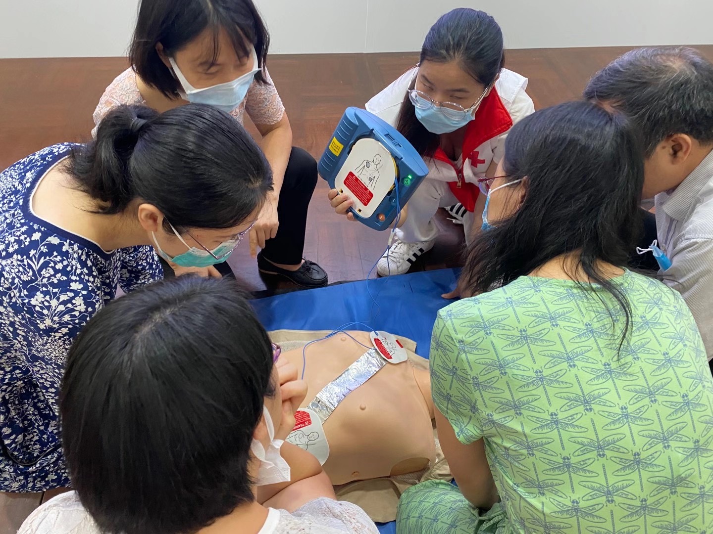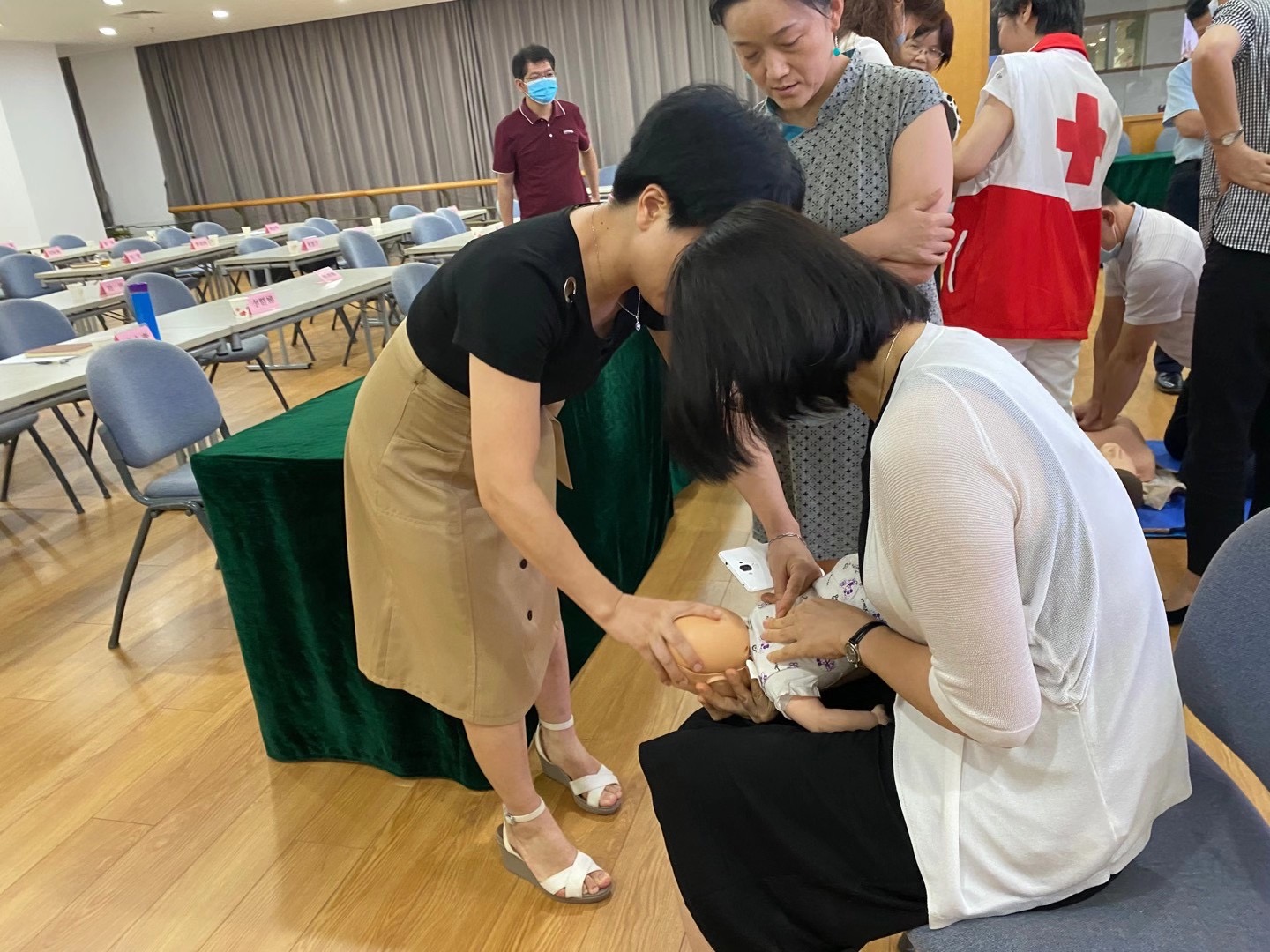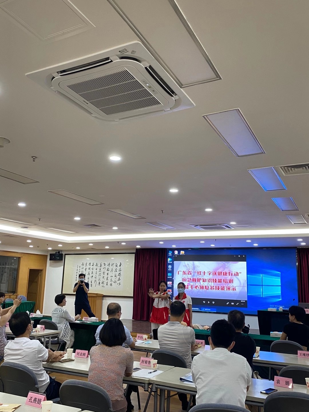 广东省红十字会志愿者广东省第二人民医院叶泽兵教授详细讲解了红十字运动基本知识,应急救援以及急救的要点,重点介绍了心肺复苏紧急救护的基本原则、方法与步骤。通俗易懂的讲解,精湛娴熟的操作深深吸引了在场所有的人员。为确保大家能够掌握心肺复苏术的操作要领,还邀请参会人员实际操作,在广东省红十字会志愿者团队手把手指导下亲手演练,达到培训效果。