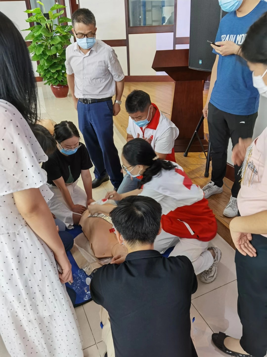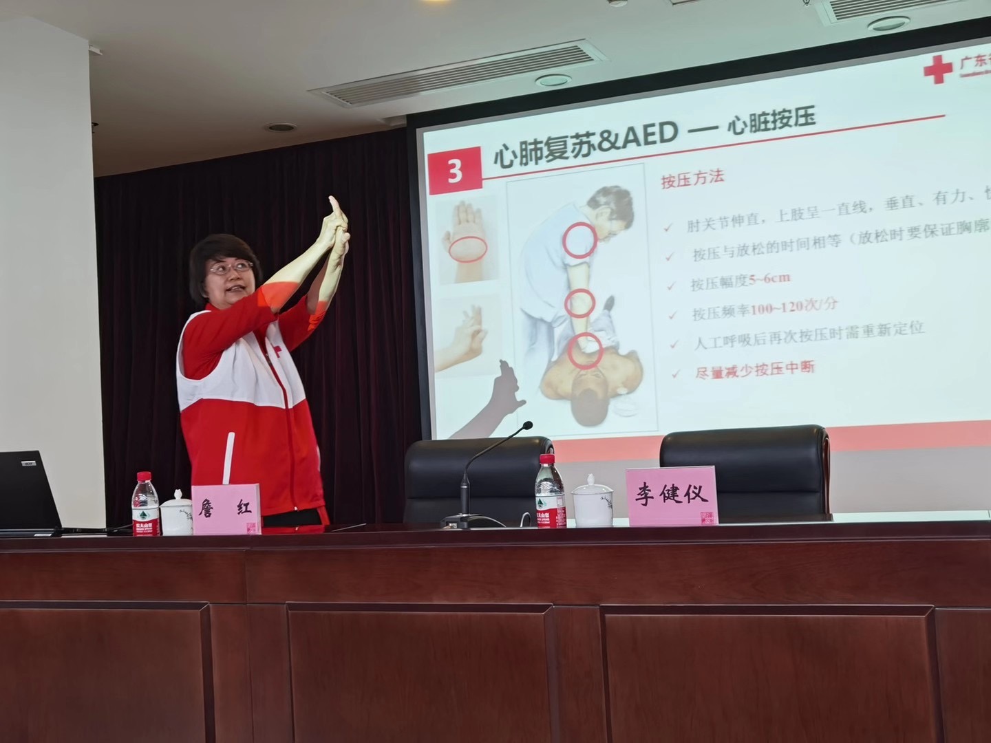 本次培训邀请了广东省红十字会志愿者中山大学附属第一医院急诊科主任詹红教授进行理论部分的讲解。詹教授结合大量丰富的案例,专业而生动地对心肺复苏术、创伤急救、意外伤害处理等应急救护知识进行了细致讲解,学员们听得津津有味。