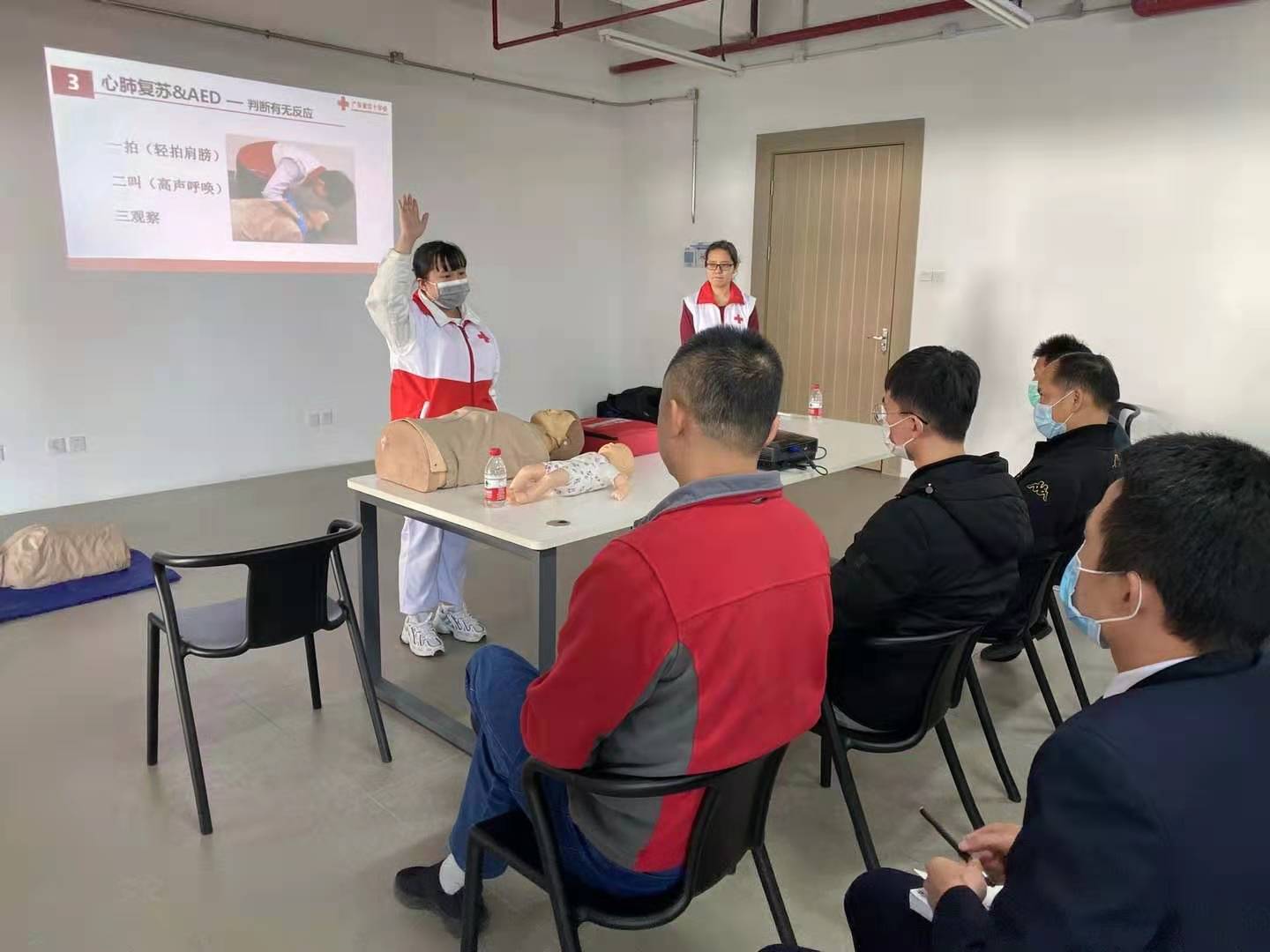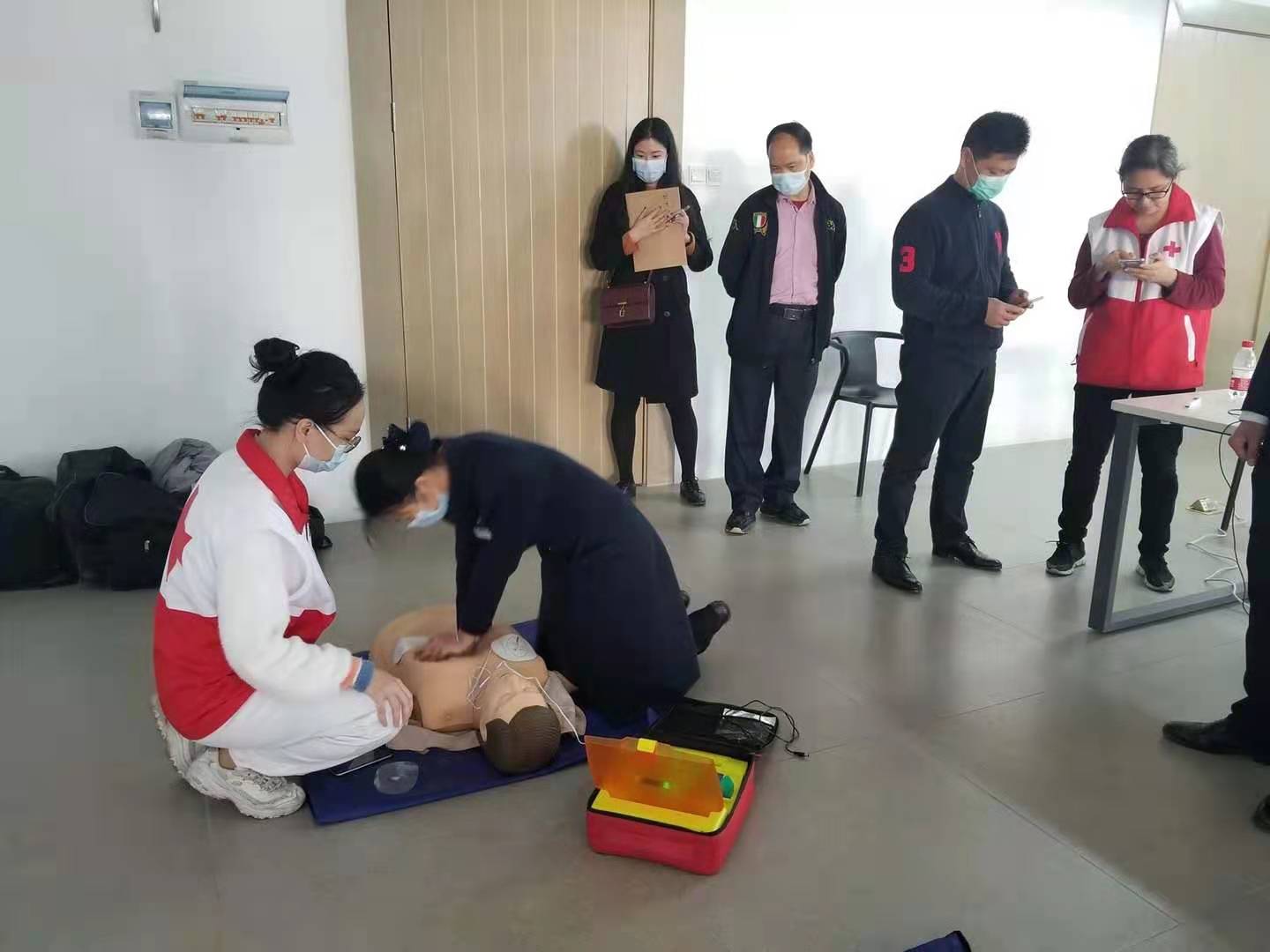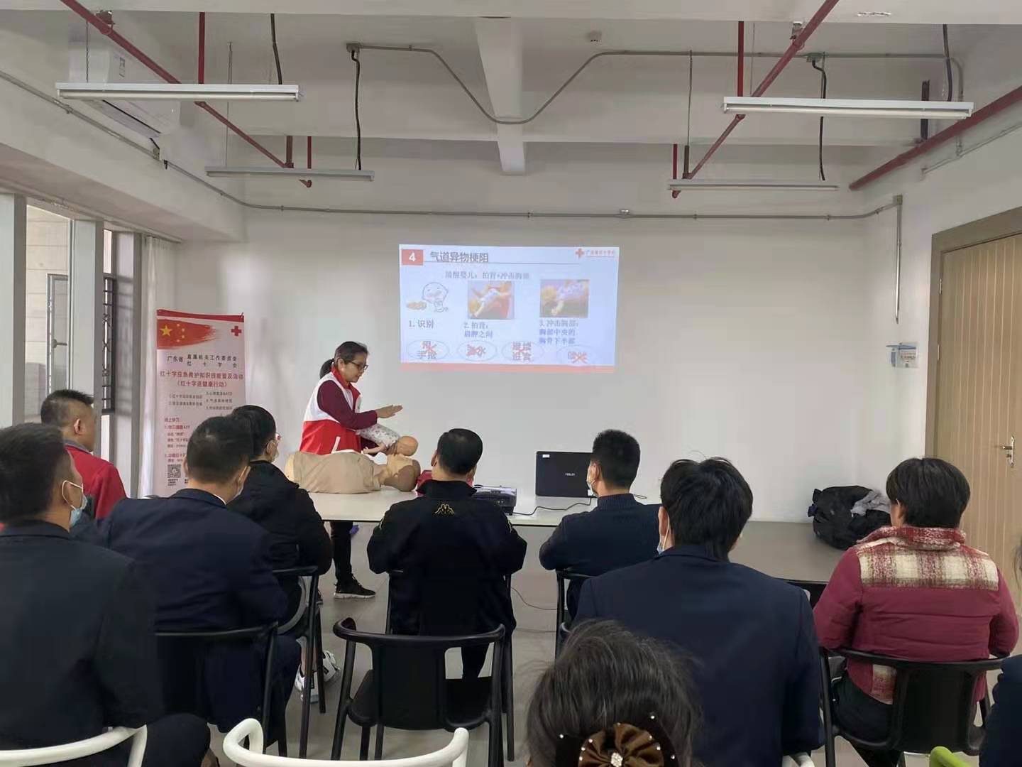 此次培训由广东省红十字会志愿者中山大学孙逸仙纪念医院宋凤卿教授进行理论讲解,通过丰富的接诊案例及知识点分析,强调现场救护的重要性以及黄金时间概念。课程中不断有干部职工纷纷赶到会议室一起参与练习,现场气氛热烈,参与度极高。