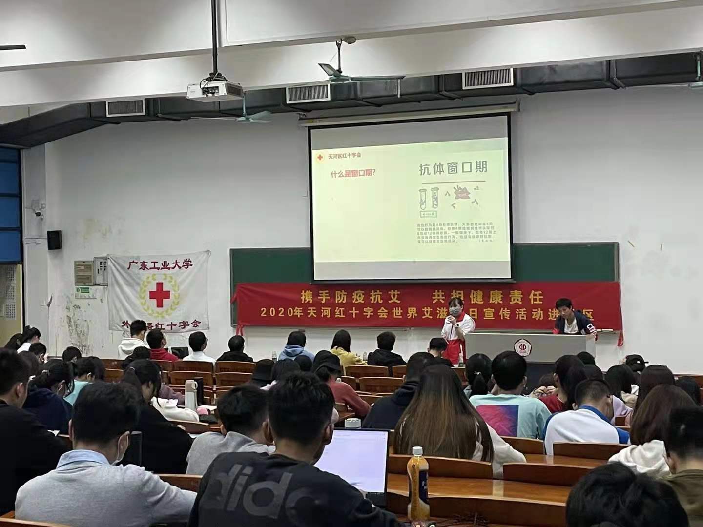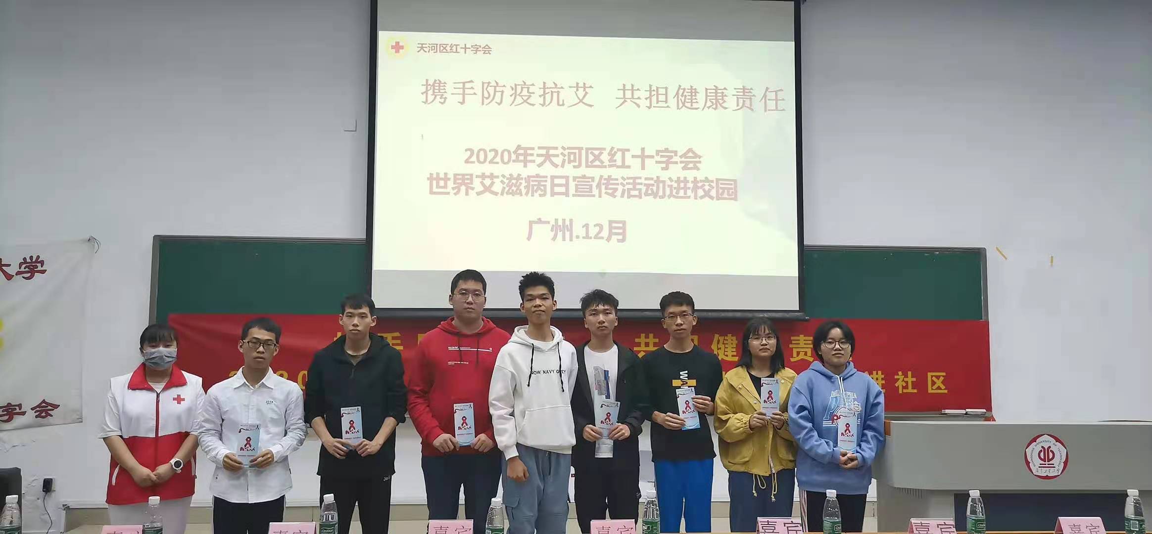 12月11日天河区红十字会走进广东工业大学开展“携手防疫抗艾、共担健康责任”知识讲座。现场有150名学生参加了此次讲座。开始前志愿者为每位同学派发了艾滋病宣传手册。
