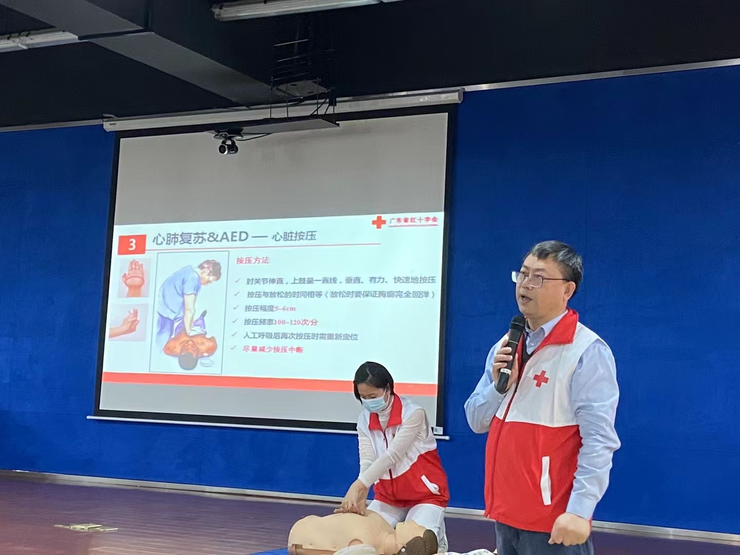 本次培训分为理论讲授和实践操作两部分,广东省红十字会志愿者中山大学孙逸仙纪念医院蒋龙元主任用身边生动鲜活的实例,对外伤止血与包扎、烧烫伤、溺水、AED、气道异物海姆立克手法、心肺复苏术等方面的急救知识进行了详细讲解,并现场通过模拟人就如何掌握基本心肺复苏技术的操作要领及注意事项进行了示范。