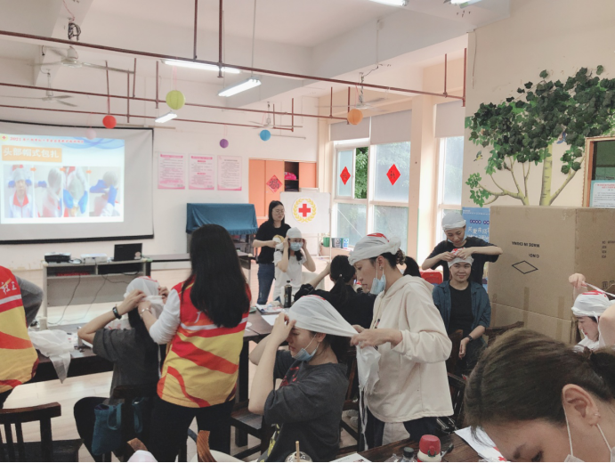 课程开始后主讲老师首先向到场学员介绍广州市红十字会,以及红十字运动知识,接着以自己在工作中亲身碰见的事情,围绕对灾害事故及突发事件的应急处理,紧急救护知识及急救方法,如何进行自救互救、减少伤亡等内容做了深入回顾讲解,并现场指导学员对心肺复苏、气道梗塞急救、创伤救护、止血、包扎、骨折固定等方面的救护技能进行演示和训练操作。