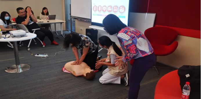 为使参与活动的学员能更深入了解现场应急救护知识。授课老师采用大量院前急救的案例导入课程,主要讲解了心肺复苏、气道异物梗阻等内容。现场的学习氛围浓厚,学员积极参与课程。