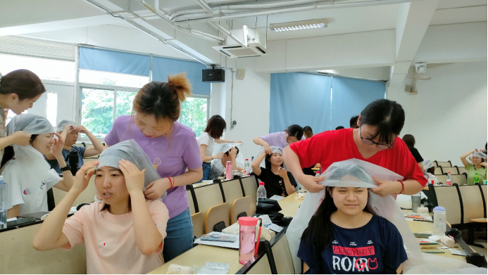 本轮培训李医生采取理论与实践相结合的方式,讲解了创伤后止血、包扎、固定、心肺复苏、自动除颤仪(AED)的使用等急救技能,并结合授课内容进行了模拟示范,手把手地教同学们如何用三角巾进行不同创伤部位的止血和包扎等。