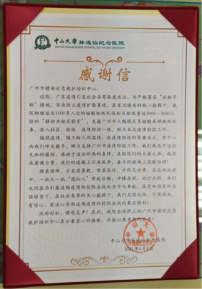 目前,健安培训全体人员分别在中山大学孙逸仙纪念医院南院和北院,天河体育中心新冠疫苗临时接种点进行着志愿服务。今日,广州出现本轮疫情“零新增”。中山大学孙逸仙纪念医院向广州市健安应急救护培训中心发来感谢信函,言辞恳切,为广州我们的家园加油鼓劲!