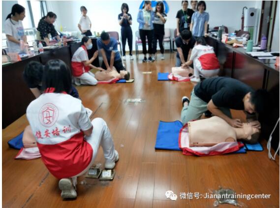 在课程中,健安导师结合理论知识点演示相关技能操作项目,包括现场心肺复苏技术,AED(自动体外心脏除颤器)使用方法、外伤现场急救的止血、包扎等四项技术。在技能训练环节,健安导师团对参训人员进行分组实操训练,并现场纠正错误操作。