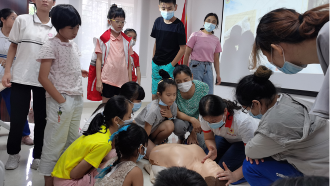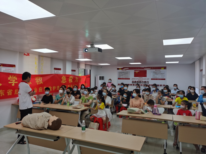 活动现场,广东省红十字应急救护老师李恒主要从心肺复苏,常见意外伤害,AED三个方面进行理论知识的讲解,他强调在心肺复苏环节,大家应该掌握四个基本的步骤:一是在确保现场安全的情况下大家才可以进入现场展开急救,二是尽快确认伤者和患者情况,三是尽快拨打急救电话,寻求专业医护人员的救助,四是用正确的方法对伤者进行救护。