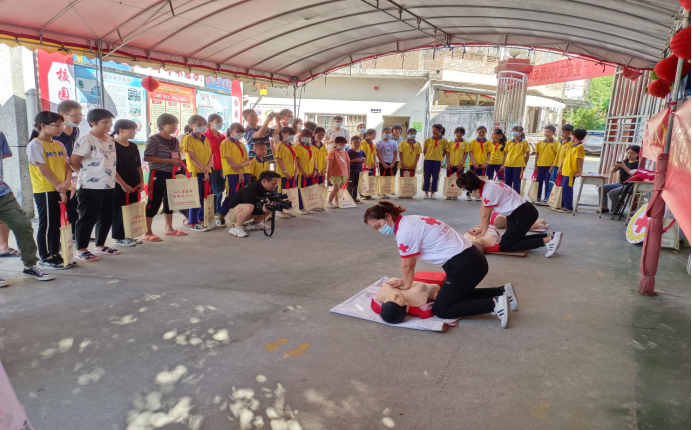 广东省红十字会应急救护师资沈红明采用现场讲解、现场模拟和实际操作相结合的方式,为群众详细宣传并现场培训应急必备常识、急救须知和心肺复苏方法。