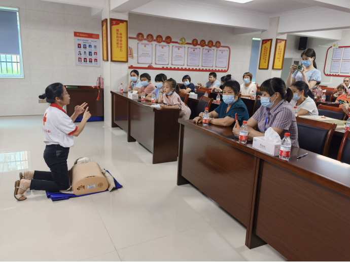 广东省红十字会应救护师资肖天美从“抢救黄金时间4分钟”急救时限的重要性讲起,普及群众较为关心的、死亡率较高的疾病“脑卒中”“心肌梗塞”等健康知识,提倡“少油少盐,戒烟限酒、合理膳食、保持良好心理状态”等健康生活理念和方式,又对新型冠状病毒对人体的侵害、预防及消毒剂的使用安全等作了讲解。最后给大家重点讲了心肺复苏应急救护知识,并用模拟人进行现场实操演示。