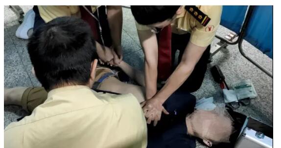 连续施救5分钟后,一位陈先生到场表示自己是红十字会救护人员,并迅速参与到抢救工作中。他发现乘客有间歇性呼吸,瞳孔有扩散的迹象,随时都有生命危险,需要持续做心肺复苏直至120急救人员到场除颤。