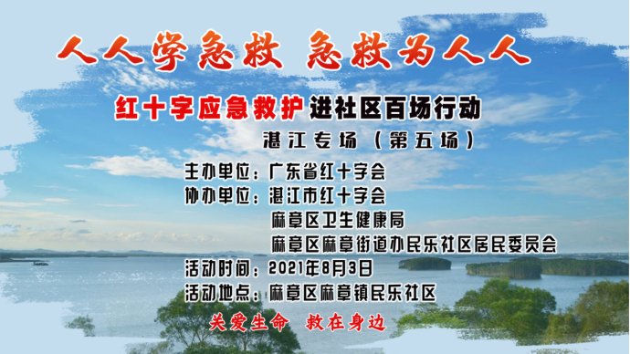 8月3日上午,广东省红十字会联合湛江市红十字会、麻章区卫生健康局、麻章区麻章街道办民乐社区居民委员会在麻章区麻章镇民乐社区开展红十字应急救护进社区百场行动湛江第五场。