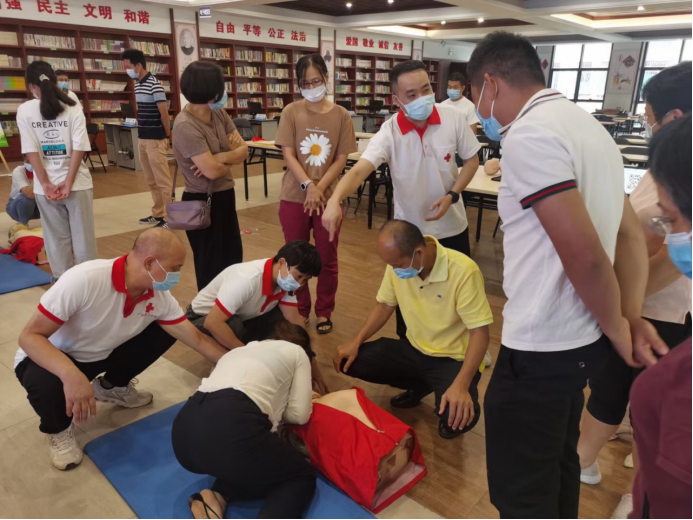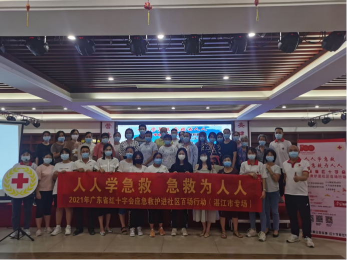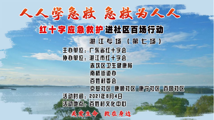 8月4日上午,由广东省红十字会举办“红十字应急救护进社区百场行动”联合湛江市红十字会、赤坎区卫生健康局、南桥街道办、百姓村委会 、京基社区、 康顺社区 、康宁社区和百园社区在百姓村文化中心开展红十字应急救护进社区百场行动湛江第七场,44名社区工作人员、志愿者、居民参加。