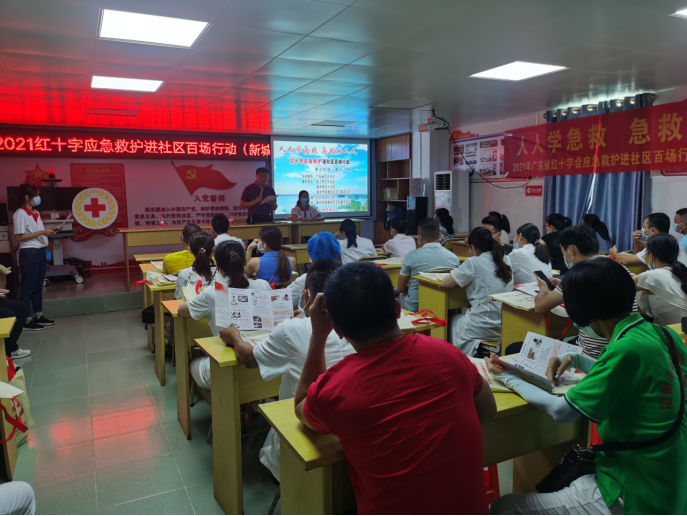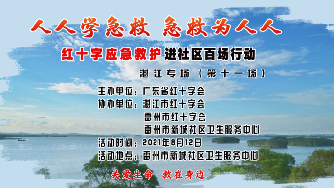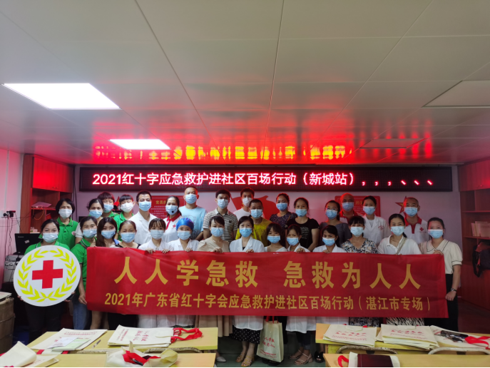8月12日上午,广东省红十字会联合湛江市红十字会、雷州市红十字会、雷州市新城社区卫生服务中心在雷州市新城社区卫生服务中心开展了红十字应急救护进社区百场行动湛江市第十一场,雷州市新城社区卫生服务中心周东主任出席活动并动员讲话,率46名社区工作人员、志愿者、居民、医护人员全程参加。