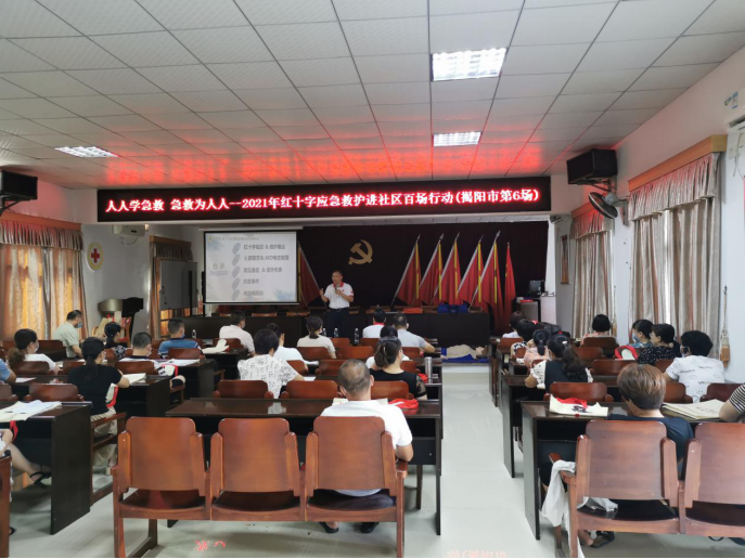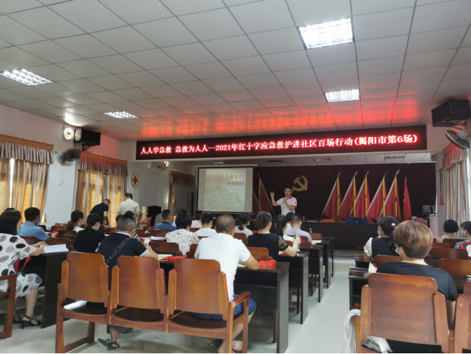 8月12日上午,广东省红十字会联合联合揭阳市红十字会、揭东区红十字会、揭东区埔田镇政府在埔田镇政府会议室共同举办了红十字应急救护进社区百场行动揭阳专场的第六场培训,邀请广东省红十字会资深讲师林鸿杰为38名社区居民、志愿者、社区工作人员及党员干部开展急救知识科普培训以及实操练习。