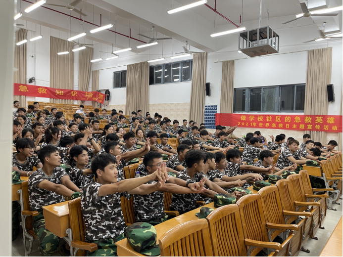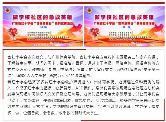 开展应急救护培训、普及应急救护知识技能是保护青少年生命健康的重要举措。为贯彻落实《健康中国行动(2019-2030年)》的要求,积极将“我为群众办实事”项目落到实处,提高大学生应急救护普及培训率,广东省红十字会联合广州体育学院、广东省红十字会应急救护志愿服务二队以世界急救日为契机,在9月6日、8日,持续2个晚上,为7个学院共23个专业的1604名新生进行8场红十字应急救护培训,实现新生培训全覆盖。