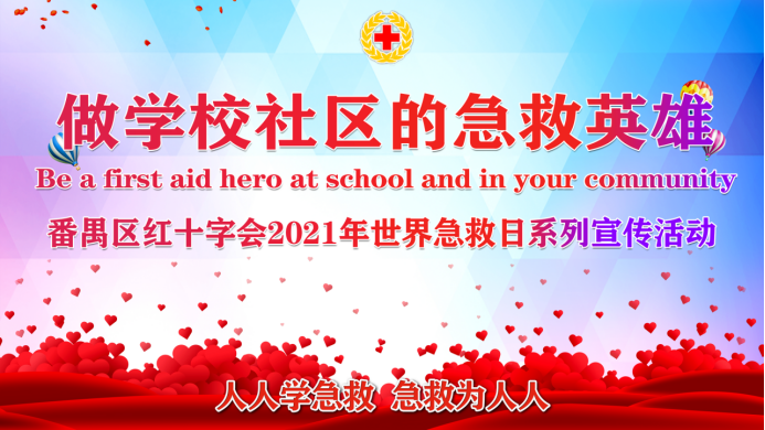 红十字会与红新月会国际联合会(以下简称“国际联合会”)将每年9月的第二个星期六定为“世界急救日”,呼吁各国红十字会或红新月会通过组织、开展各种活动,普及应急救护知识和技能,宣传与推动应急救护工作。今年的9月11日是第22个“世界急救日”,主题为“做学校社区的急救英雄”(Be a first aid hero at school and in your community)。番禺区红十字会深入开展党史学习教育,扎实开展“我为群众办实事”实践,以世界急救日”为契机开展系列宣教活动,引导青少年树立正确的健康理念,形成健康的行为和生活方式,提高健康教育教学质量、提升健康素养,创建平安校园,助力番禺区文明城市创建。