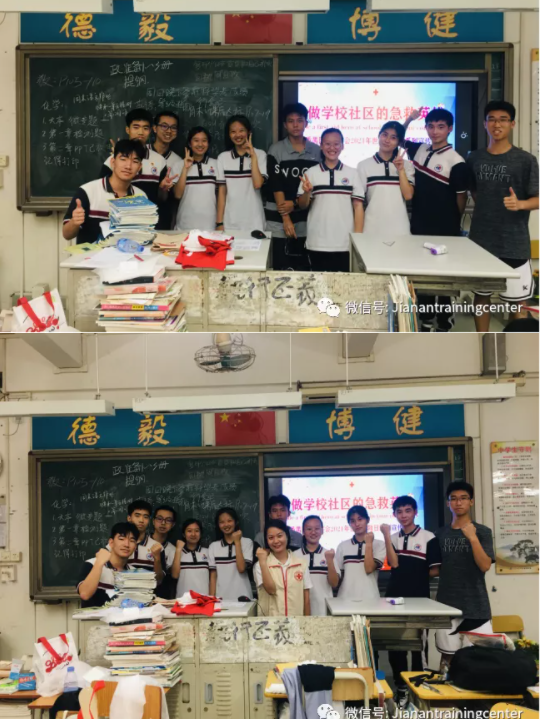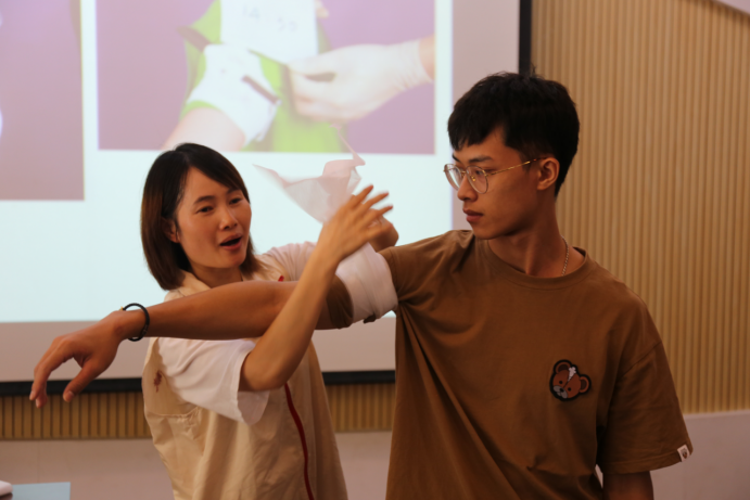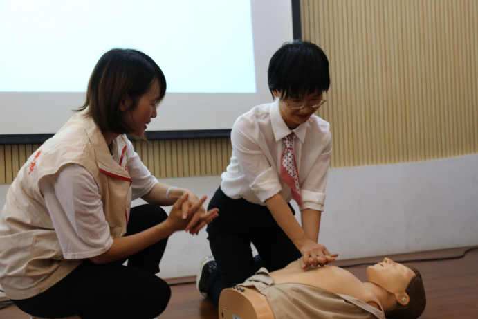 红十字会应急救护讲师在广东仲元中学通过PPT以及实际操作演示讲解心肺复苏、气道梗阻以及创伤包扎的注意方式与手法,直观地向同学们展现了应急救护的方法。