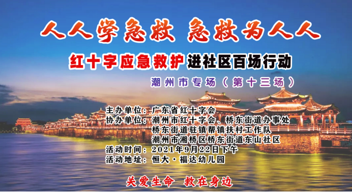 9月22日下午,广东省红十字会联合潮州市红十字会在潮州市湘桥区桥东街道东山社区开展的“红十字应急救护进社区百场行动”潮州专场第十三场活动圆满完成,旨在进一步提高社区基层工作人员和学校师生的自救互救能力,有效缩短急救反应时间,降低因突发事件死亡危害。