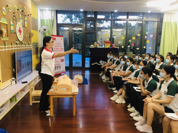 广东省红十字师资朱小丽为共45名老师、学生和工作人员,耐心细致地讲述了气道异物梗阻急救、心肺复苏术、伤口处理、触电急救、溺水急救等不同意外急救知识。