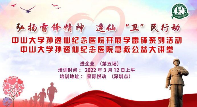 为提高职工的应急处置能力,3月初中山大学孙逸仙纪念医院举办的“弘扬雷锋精神,逸仙”卫”民行动”应急救护公益大讲堂(第五场)走入星际悦动(深圳点)为20余名职工开展培训,大家严格遵守防疫要求,全程佩戴口罩,做好个人防护。
