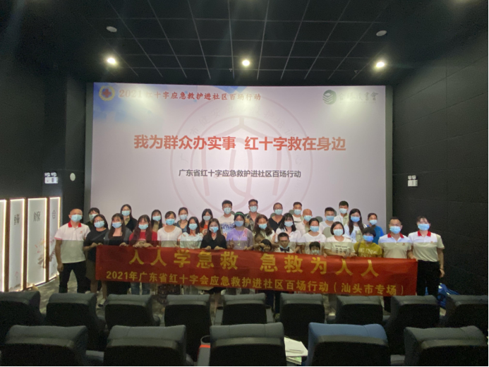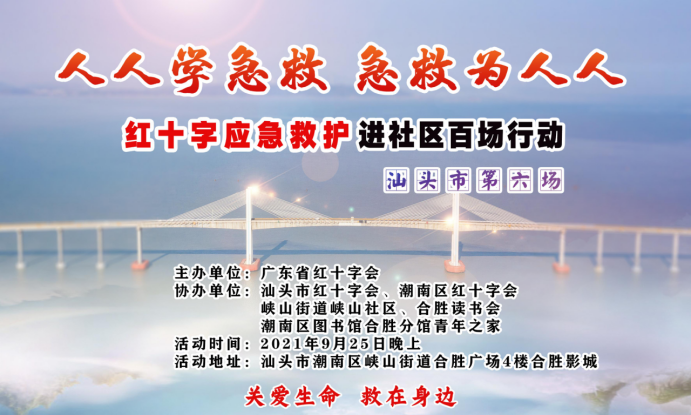 9月25日晚上,由广东省红十字会举办的“红十字应急救护进社区百场行动”汕头专场第六场培训,在汕头市红十字会 、潮南区红十字会、峡山街道峡山社区的精心安排下在合胜广场开展,参加培训的有社区工作人员、影迷、和居民共50人。