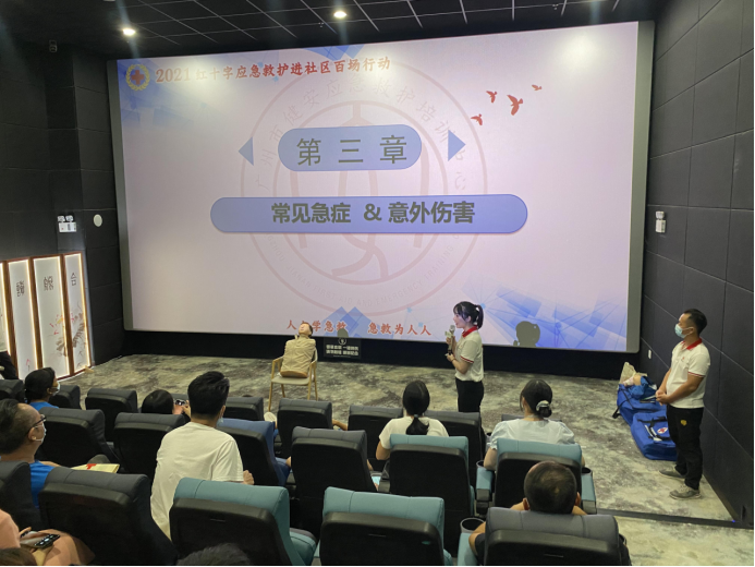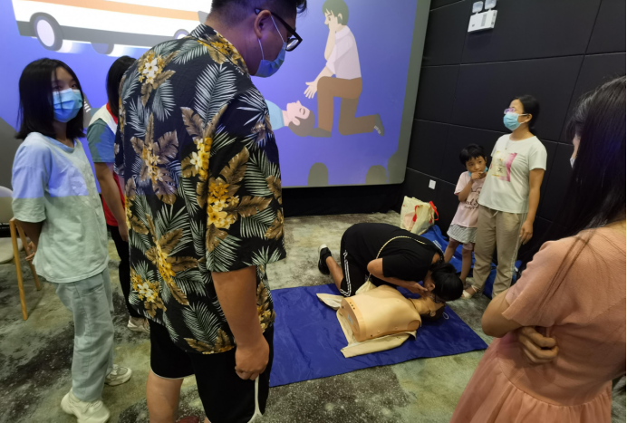 红十字会师资张丽老师在课程中用成功施救的案例激发大家勇于施救的信心,采取提问的方式鼓励大家投入到课程中,带着大家一起练习,此时在合胜广场4楼合胜影城正传来“01,02,03,04......”数着节拍的声音。