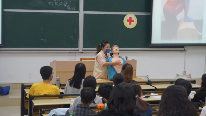 对知识点内容详细介绍后,老师根据技能要点逐一示范心肺复苏操作、腹部冲击法、止血方法、三角巾包扎法等等。