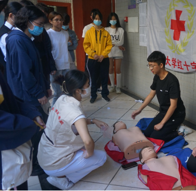 红十字会老师首先从“红十字会起源于战场救护,其创始人是亨利•杜南”开始介绍红十字运动知识,到“现场实施CPR流程是:安叫叫CABD。C是胸外按压,A是开放气道,B是人工呼吸,D是电除颤。”……