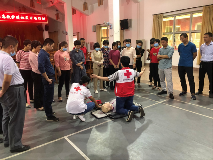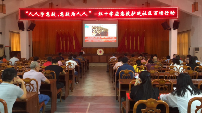 10月20日下午,由广东省红十字会主办的红十字应急救护进社区百场行动梅州专场第十五场活动在梅县区程江镇人民政府举行,共有51名乡镇党员干部、居民参加,课程由红十字救护师资黄媚主讲。