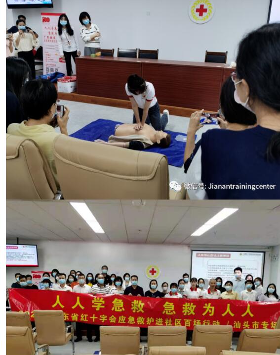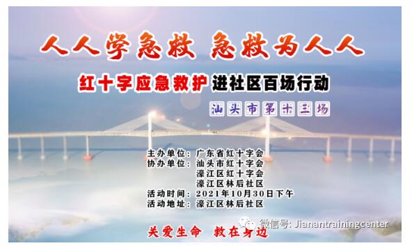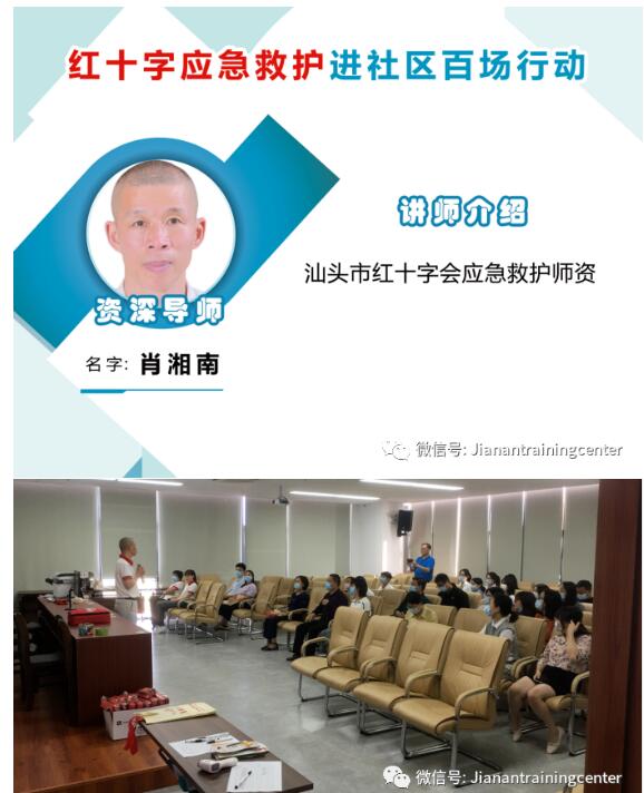 10月30日下午,广东省红十字会联合汕头市红十字会,濠江区红十字会、林后社区举办“红十字应急救护进社区百场行动”汕头第十三场培训,红十字会师资肖湘南为46名社区居民讲授心肺复苏、AED和意外伤害等急救知识。