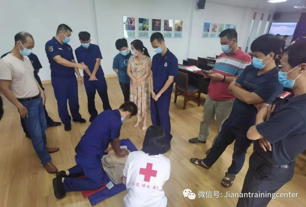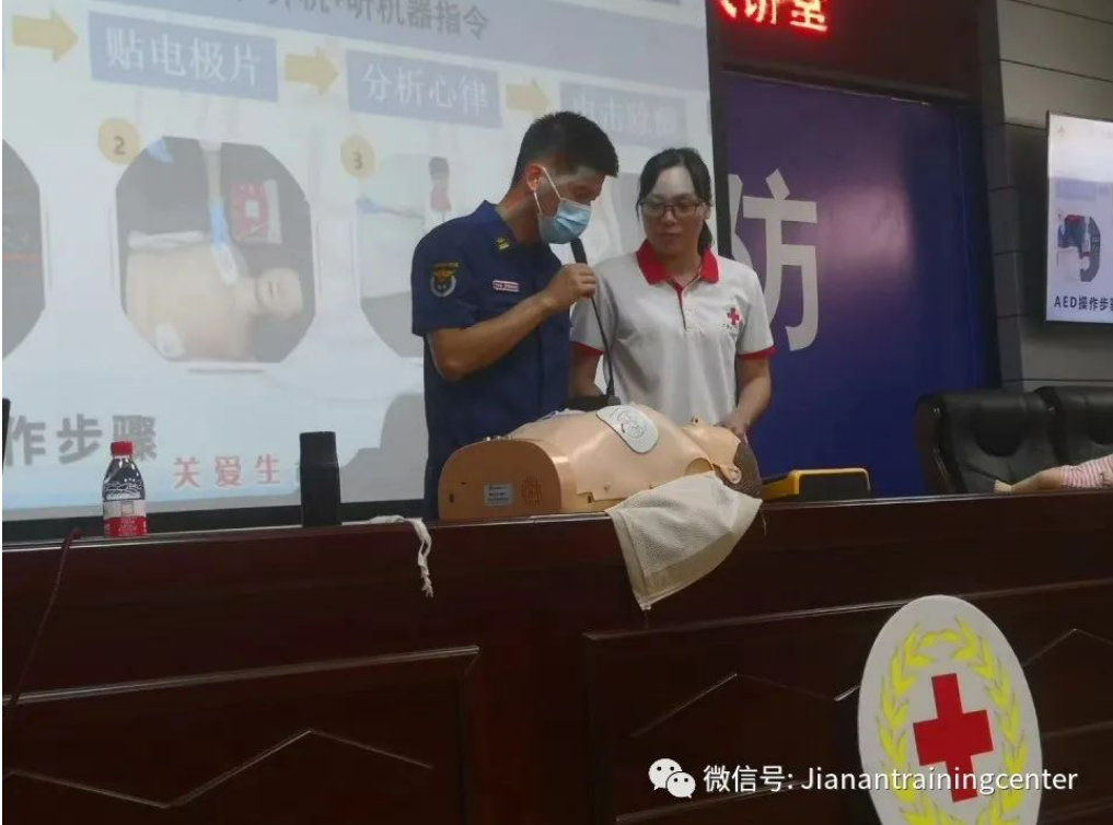 红十字救护师资陈燕珊向大家详细介绍了心肺复苏的具体实施程序、AED的使用方法和创伤救护术。参训人员认真听讲、主动请教,并积极参与实操,仔细学习每一道程序、每一个动作。