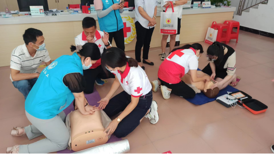 红十字会应急救护师资李勇军讲解了红十字知识、心肺复苏、创伤救护、AED等急救知识。在理论结束后,红十字会志愿者团队还辅导大家进行了应急救护训练。参训党员干部、村民积极参与到心肺复苏手法练习中来,不到位的按压手法由导师们一一纠正以提升心肺复苏按压质量,不断的提高大家在遇到真正的危险时的反应能力。